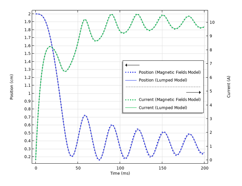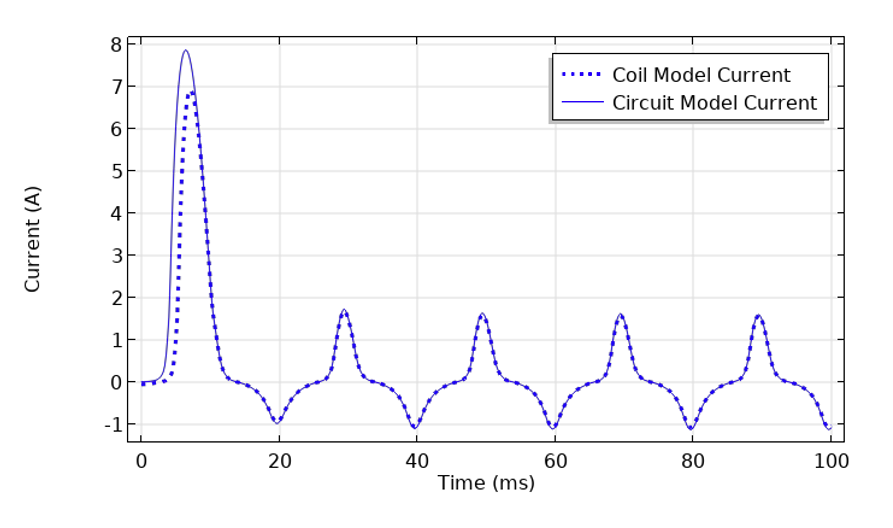 We use a Resistor feature with resistance equal to the computed Coil resistance. In series with that, we add an Inductor feature with a nonlinear inductance defined via the Interpolation table that stores our previously computed differential inductance. This nonlinear inductance can be made a function of the absolute value of the current, since the nonlinear behavior is not dependent upon the sign of the current. Finally, the Voltage Source feature, can be placed in series. Together, these three features create a lumped model that can predict the response. The results from this lumped model can be compared to the finite element model. Note that over the first few periods, the models are still only starting to approach the periodic steady-state response of this nonlinear system.